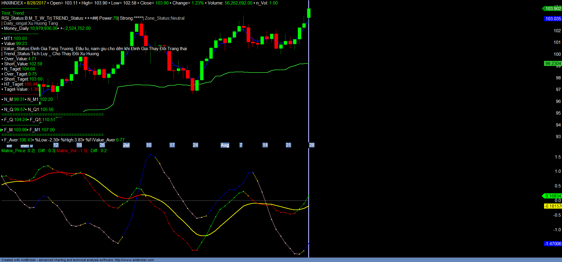 + Về thị trường chung, HNXNIDEX đã vượt vùng kháng cự cũ 103.3 với thanh khoản tiếp tục được cải thiện. Mặc dù chỉ số HNXINDEX đang vượt đỉnh cũ nhưng xu hướng ngắn hạn của HNXINDEX lại chuyển từ Tăng trưởng ngắn hạn thành Tích lũy_ Chờ thay đổi xu hướng. Do đó, về mặt điểm số trước mắt nhà đầu tư chưa nên kỳ vọng gì lớn trong giai đoạn này. Tuy nhiên do khẳ năng sinh lợi của các mã, nhóm mã đã tăng lên. Vì vậy nhà đầu tư nên tập trung vào danh mục mạnh đang có tín hiệu dòng tiền tham gia và đủ các điều kiện tăng trưởng mua vào. Chi tiết tham khảo Matrix_Filter.