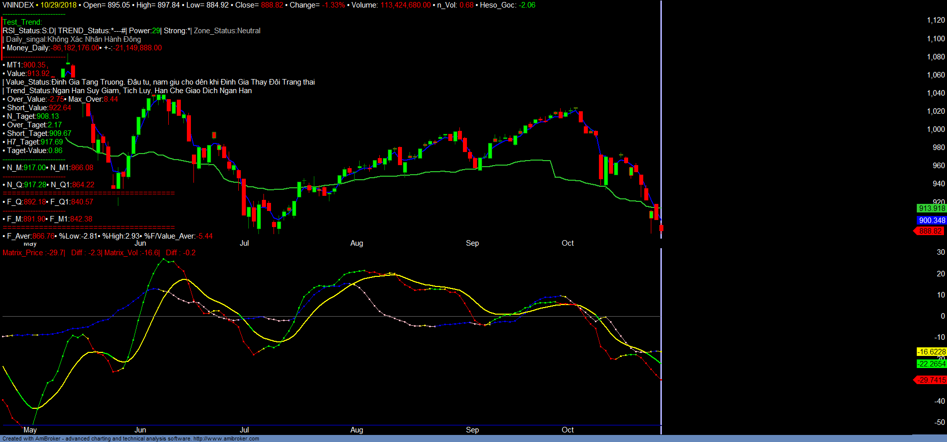 + Trend_up giảm, Money_in giảm. Trend_up tiếp tục giảm, dòng tiền giảm. Thị trường vẫn trong vùng quá bán ngắn hạn.