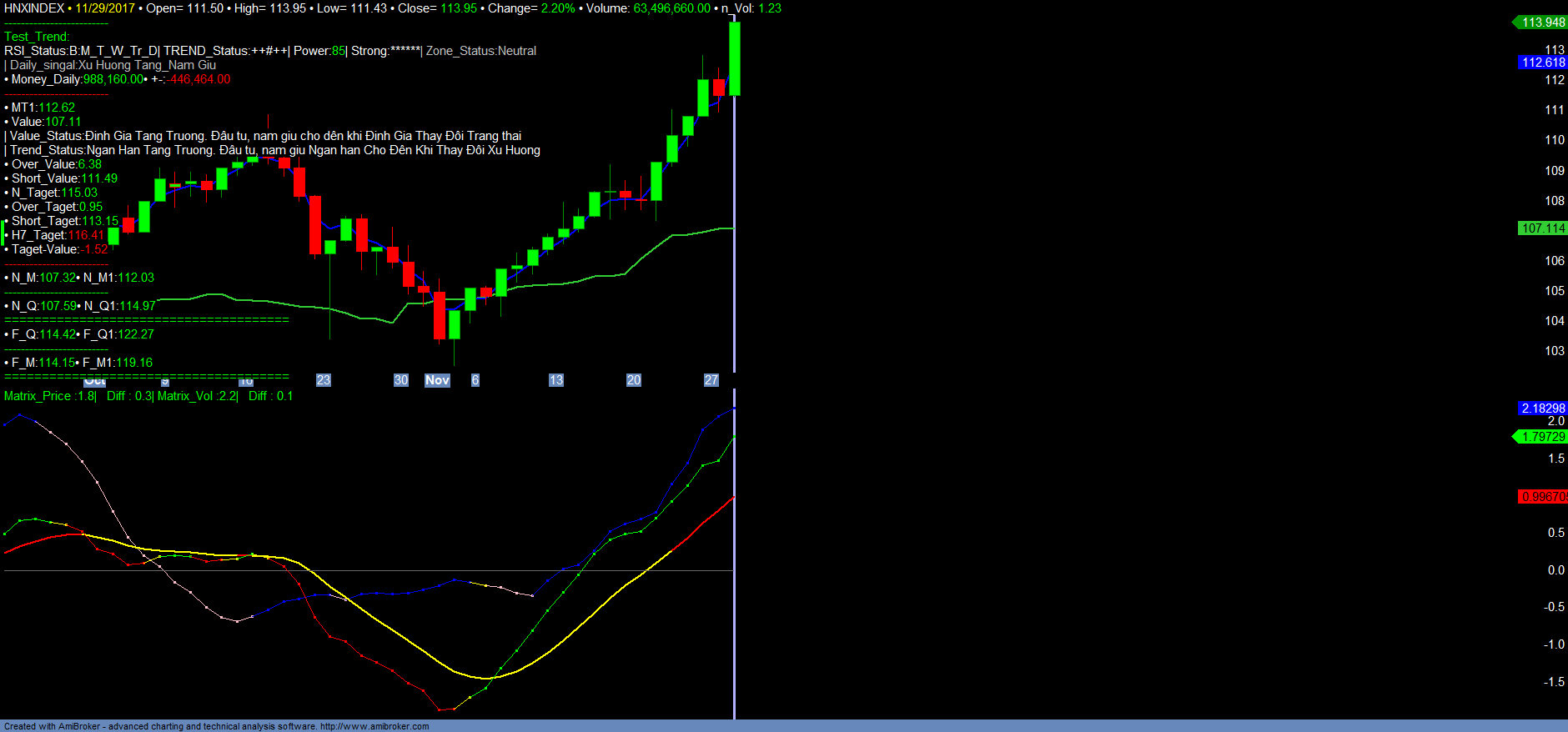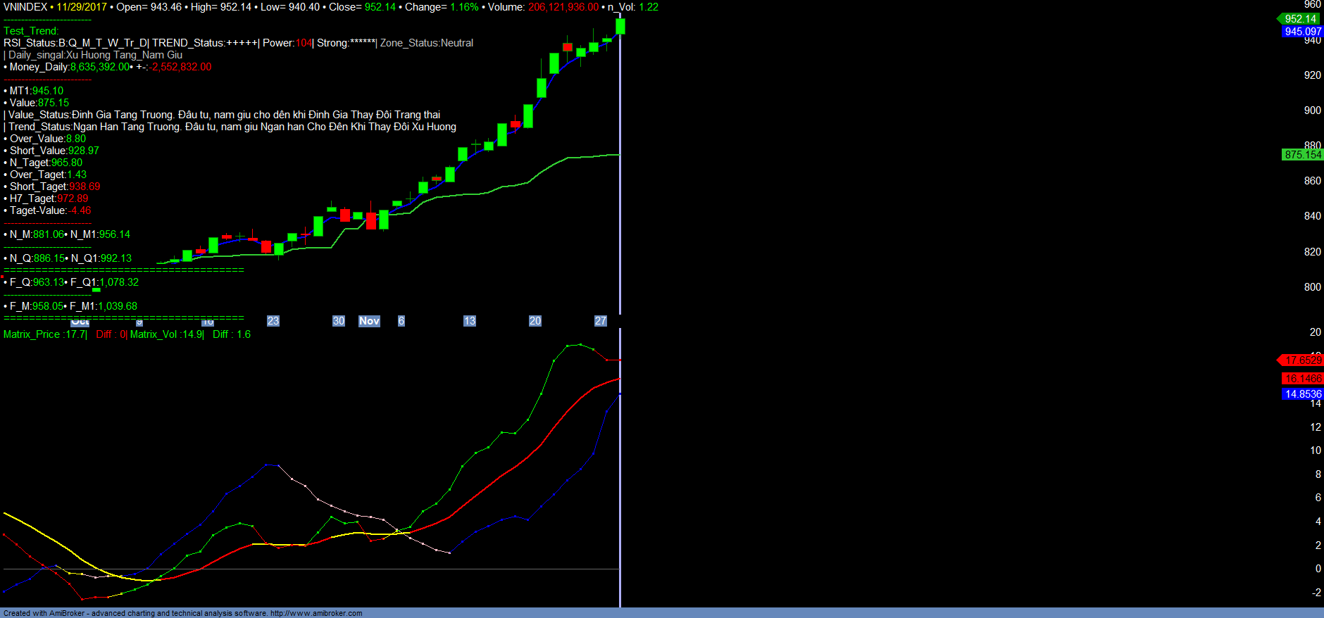 – VNINDEX vẫn tiếp tục tín hiệu tăng trưởng Strong_trend dưới ảnh hưởng của VN30. VN30 liên tục tăng mạnh, đi vào vùng Over mạnh. Dòng tiền ngắn hạn của VN30 vẫn chưa có dấu hiệu phục hồi tăng trở lại. Mặc dù phiên giao dịch hôm nay 29/11/2017 chỉ số VNINDEX cũng như VN30 đều đã vượt đỉnh cũ. Tuy nhiên bắt đầu xuất hiện tín hiệu rủi ro ngắn hạn trên vùng over cực đại ngắn hạn đối với VN30 và VNINDEX. HNXINDEX đã vượt đỉnh cũ và vượt kháng cự mạnh dài hạn, đang xác nhận tăng trưởng dài hạn. Dự kiến trong một vài phiên giao dịch đến VNINDEX và VN30 sẽ tiếp tục tăng lên vùng 965+- và 957+-, và bắt đầu xảy ra rung lắc điều chỉnh để kiểm tra lại các mốc hỗ trợ quan trọng. Vì HNXDEX vẫn đang xác nhận tăng trưởng dài hạn, nên ngắn hạn thị trường điều chỉnh rung lắc là bình thường trong vùng quá mua cực đại của VNINNDEX cũng như VN30. Nhà đầu tư hạn chế mua đuổi trong những phiên giao dịch đến. Tiếp tục nắm giữ các mã tăng trưởng mạnh trong danh mục. Vẫn có thể mở rộng vị thế mua ngắn hạn, đối với các mã có xu hướng ngắn hạn tăng trưởng và vào xu hướng tăng trong danh mục trend mới, khi nhóm mã này điều chỉnh về vùng hỗ trợ ngắn hạn Short_Value. Ưu tiên nhóm mã mạnh, nhóm mã Hạ tầng, KCN, bất động sản. Vị thế mua sẽ được xem xét đóng, khi có tín hiệu dòng tiền suy yếu. Chi tiết tham khảo Matrix_Fiter và các Danh mục.