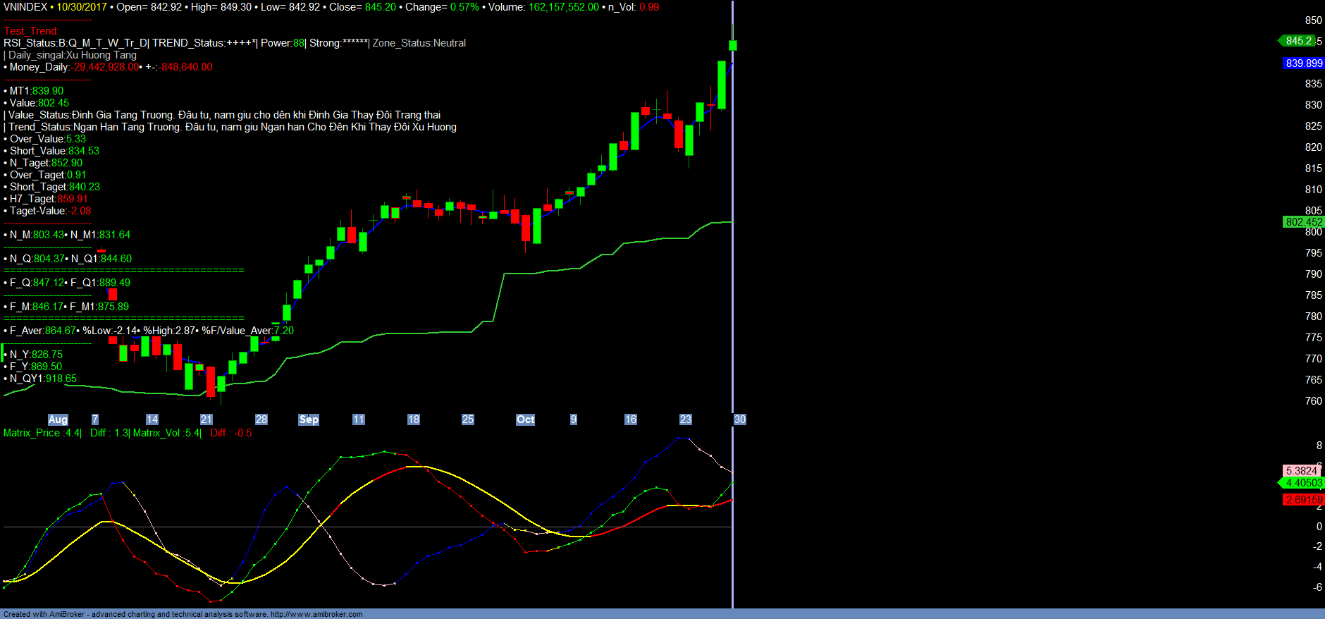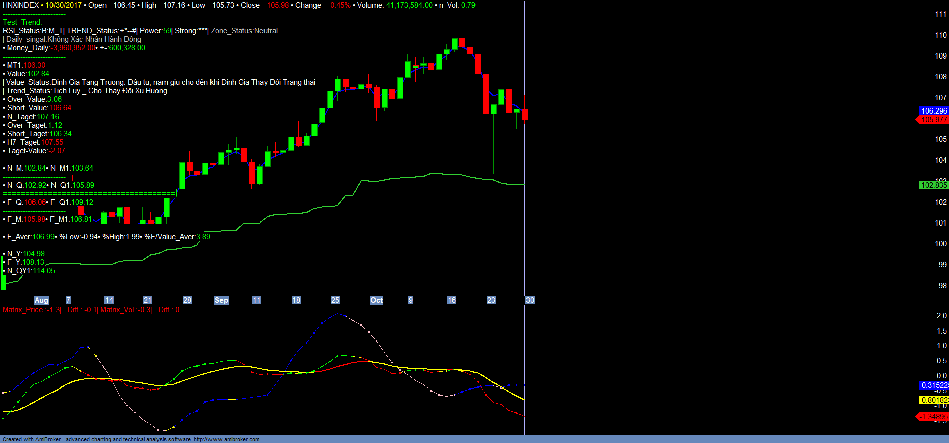 + Thống kê thị trường: Trend_up giảm, tốc độ suy giảm đã chậm lại. Money_in giảm. VNINDEX, VN30 tiếp tục chinh phục mốc cao mới, với ROS là nhân tố chính ảnh hưởng. Hiện nay tại vùng giá này, khối lượng giao dịch ROS đã suy yếu dần, và dòng tiền đang chuẩn bị có tín hiệu rút dần khỏi ROS. Mặc dù điểm số VN30 và VNINDEX tiếp tục tăng vượt giá trị đỉnh cũ, tuy nhiên bản chất toàn thị thị trường vẫn suy yếu, khẳ năng sinh lợi của toàn thị trường và dòng tiền vẫn suy giảm. Áp lực bán hạ tỉ trọng ngắn hạn rất lớn. Khá nhiều mã bị áp lực bán mạnh, điển hình như HSG, HBC…. Chỉ số HNXINDEX hiện đang cho tín hiệu kết thúc giai đoạn tăng trưởng mạnh kéo dài từ tháng 12/2016 ở vùng giá 78-80 đến 110 hiện nay. Dự kiến HNXINDEX sẽ chuyển sang giai đoạn điều chỉnh tích lũy để kiểm tra lại xu hướng tăng trưởng của giá trị định giá. Như vậy hiện nay việc mở thêm vị thế mua mới vẫn chưa được khuyến nghị gia tăng. Nhà đầu tư tiếp tục cân đối tỉ trọng ngắn hạn. Kiên nhẫn chờ tín hiệu Trend_up tích lũy tạo đáy và phục hồi trở lại, cũng như chờ tín hiệu HNXINDEX kết thúc xu hướng tích lũy và test xu hướng tăng trưởng của định giá thành công. Kiên nhẫn chờ đợi thị trường xác nhận nhóm mã, các mã sẽ tiếp tục có xu hướng tăng trưởng mạnh trong năm tài khóa 2018 sắp đến. Chi tiết tham khảo Matrix_Fiter và các Danh mục.