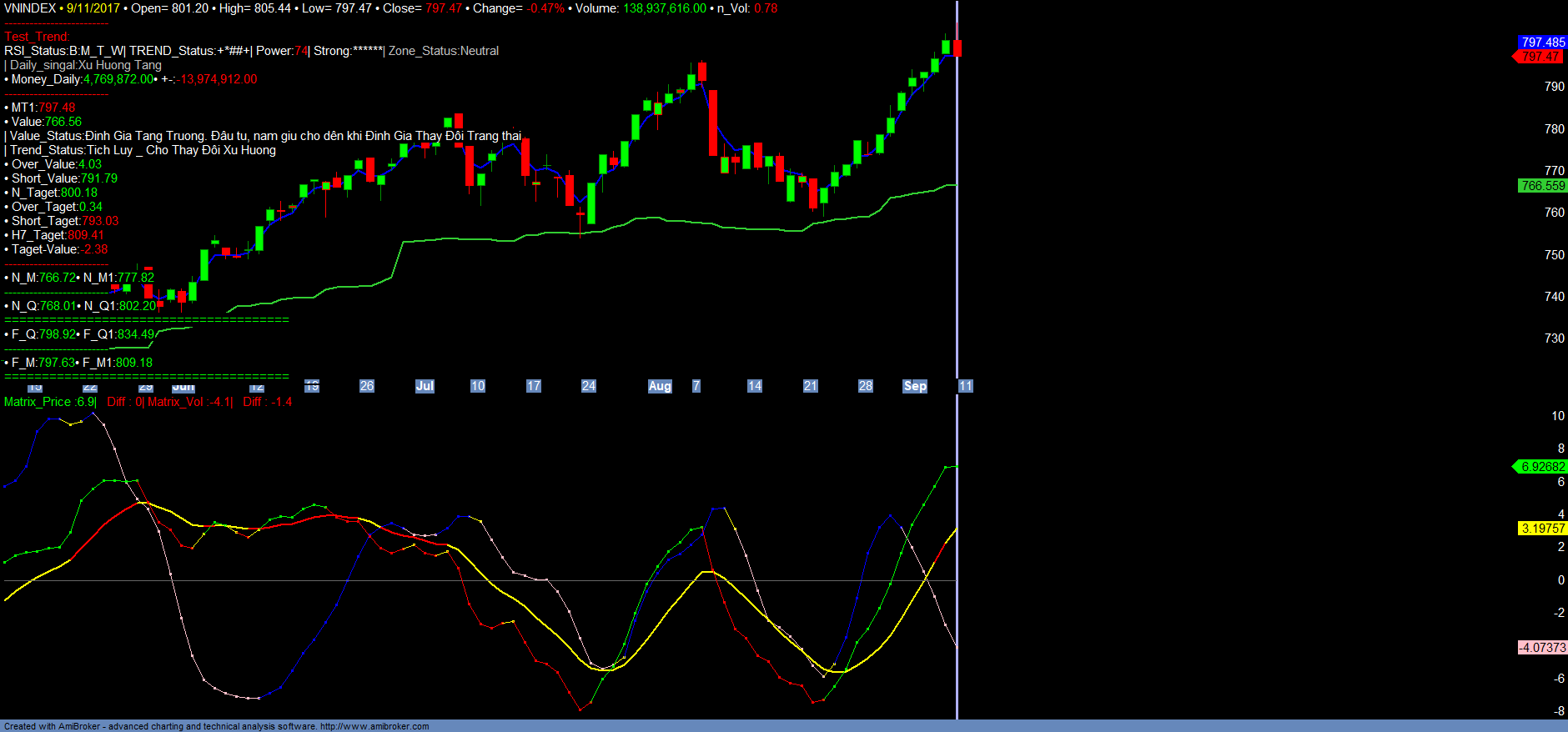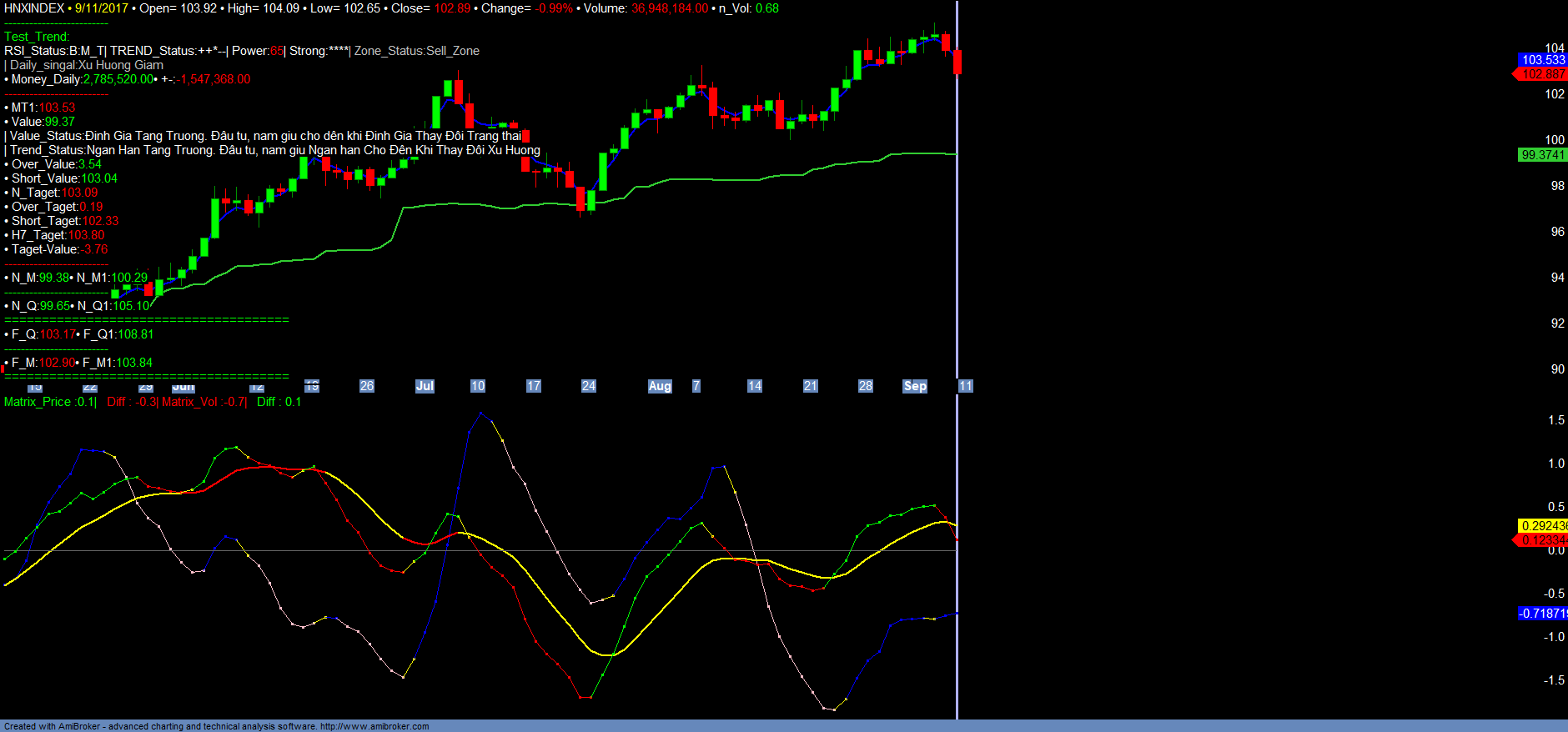 + Trong ngắn hạn với việc VNINDEX, VN30 liên tục tăng mạnh đã đi vào vùng quá mua ngắn hạn, dự kiến sẽ có rung lắc điều chỉnh, để kiểm tra lại hỗ trợ ngắn hạn, định giá tăng trưởng của VNINDEX và HNXINDEX hiện nay là 766+- và 99+-. Ngắn hạn nhà đầu tư có thể hạ tỉ trọng các nhóm mã đã tăng mạnh và ảnh hưởng chính đến VNINDEX, HNXINDEX và cover lại tại giá trị hỗ trợ ngắn hạn Short_value của các mã đấy. Trong và sau quá trình rung lắc, điều chỉnh của chỉ số INDEX mà chủ yếu là VN30 xảy ra, dư kiến nền tảng thanh khoản, money_in của thị trường sẽ được cải thiện trở lại, cũng như độ rộng, xu hướng Trend_up sẽ mở rộng qua các nhóm mã khác, nhất là các nhóm mã có xu hướng Định giá là tăng trưởng để đón đầu báo cáo kết quả kinh doanh Quí III chuẩn bị công bố. Nhà đầu tư lưu ý, giai đoạn cuối tháng 09/2017 đến đầu tháng 10/2017 hệ thống Matrix_Filter sẽ cập nhật định giá thị trường. Đối với các mã có xu hướng định giá Suy giảm, giá trị Định giá sẽ suy giảm, nhà đầu tư hạn chế tham gia vào các nhóm mã này. Chỉ tham gia vào các mã Định giá Tăng trưởng (Đối với các nhóm mã tăng trưởng mà hầu như không tăng giá trong thời gian gần 2-3 tháng vừa qua, Nhà đầu tư nếu có, vẫn nên tiếp tục kiên nhẫn nắm giữ trong quá trình rung lắc điều chỉnh của thị trường trong 1-2 tuần sắp đến để chờ thị trường định giá lại), hoặc Định giá Tích lũy chờ tín hiệu Tăng trưởng, cũng như chờ nhóm cổ phiếu VN30 điều chỉnh để mở rộng, gia tăng đầu tư.