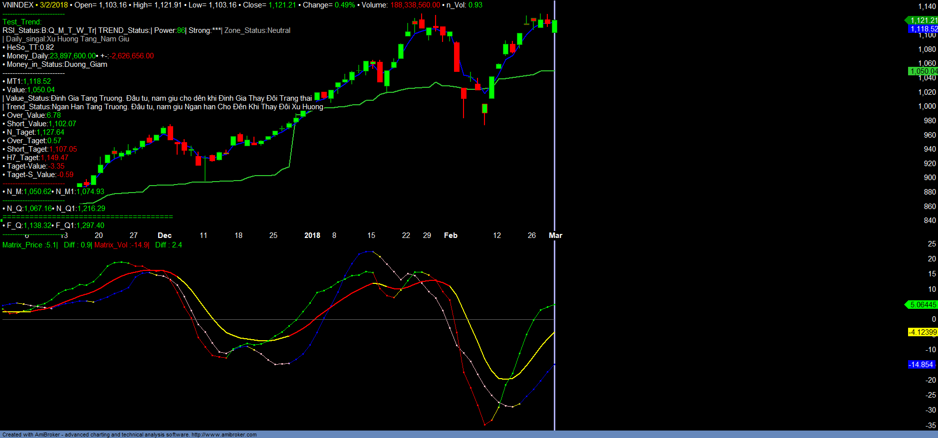 + VNINDEX, VN30 sau thời gian tăng liên tục kéo dài từ 12/2016 đến nay, mặc dù trong ngắn hạn đã được nâng mức Định giá tuy nhiên mức tăng không đủ lớn để nâng khẳ năng sinh lợi (Taget – Value âm). Điều này làm cho dòng tiền ngắn hạn của VN30 bắt đầu suy giảm. Chỉ số tương lại VN30F tiếp tục cho khẳ năng sinh lợi kém, phân kỳ so với VN30. Cho thấy kỳ vọng tương lai đang suy giảm. Với nền tảng khối lượng giao dịch thấp của VN30, cần phải tích lũy để đạt chuẩn dòng tiền Money_in tăng trở lại. Cũng như chờ thị trường tiếp tục nâng định giá trong thời điểm chốt NAV quí 1/2018 sắp đến mới đủ điều kiện để đánh giá khẳ năng vượt đỉnh tiếp theo.
