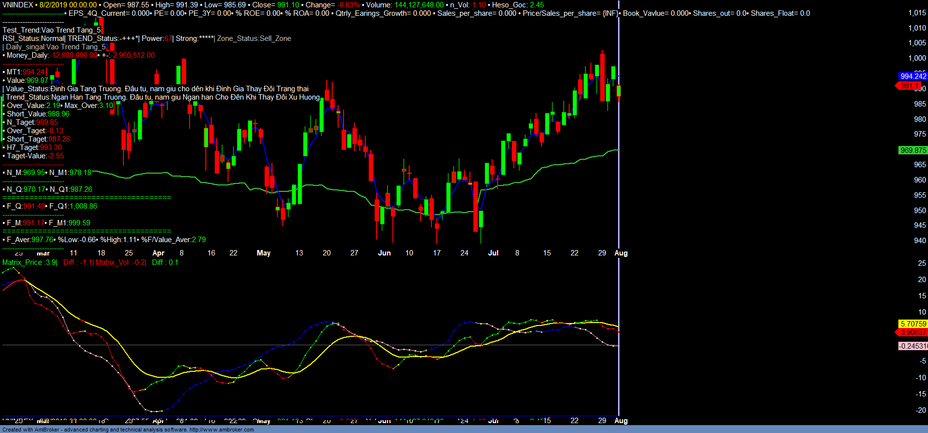 + Trend_up giảm, Money_in tăng. Khẳ năng sinh lợi trên toàn thị trường vẫn giảm. Tuy nhiên dòng tiền đã gia tăng trở lại. Do nhiều nhóm mã, như dệt may, thủy sản, nhiệt điện, hay các nhóm mã đã bị điều chỉnh giảm mạnh, tích lũy về vùng giá hấp dẫn đang thu hút dòng tiền ngắn trung hạn trở lại. Điều này dẫn đến số lượng mã có vùng mua ngắn hạn đã gia tăng tốt trở lại và lớn hơn vùng bán. Như vậy có thể tiếp tục xem xét gia tăng thêm vị thế mua vào.