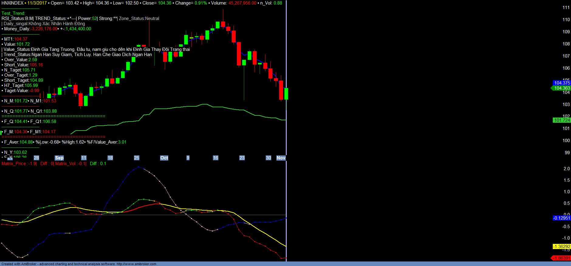 – Do xu hướng ngắn hạn của HNXINDEX là giảm giá, giá trị Short_value sẽ giảm theo thời gian. HNXINDEX ngắn hạn sẽ phải tích lũy trong biên độ giữa giá tri ngắn hạn Short_value và giá trị Định giá cho đến khi cho đến khi xu hướng ngắn hạn chuyển sang phục hồi và tăng trưởng. Vì vậy, nhịp phục hồi này dự kiến diễn ra trong 3-5 phiên giao dịch để kiểm tra lại giá trị Short_value tương ứng 105.5-106, sau đó HNXINDEX sẽ tiếp tục tích lũy. Như vậy hiện nay việc mở thêm vị thế mua chỉ phù hợp lướt sóng cho nhịp hồi ngắn hạn. Nhà đầu tư tiếp tục duy trì tỉ lệ danh mục cân bằng, kiên nhẫn chờ tín hiệu Trend_up tích lũy tạo đáy và phục hồi trở lại, cũng như chờ tín hiệu HNXINDEX kết thúc xu hướng tích lũy và test xu hướng tăng trưởng của định giá thành công. Kiên nhẫn chờ đợi thị trường xác nhận nhóm mã, các mã sẽ tiếp tục có xu hướng tăng trưởng mạnh trong năm tài khóa 2018 dự kiến sẽ xuất hiện trong thời gian sắp đến. Việc tham gia vào sóng hồi dự kiến là không được khuyến nghị. Nếu muốn chỉ nên gia tăng mua vào ngắn hạn đối với các mã đạt vùng mua trong danh mục Trend mới với xu hướng ngắn hạn là Tăng trưởng. Chi tiết tham khảo Matrix_Fiter và các Danh mục.