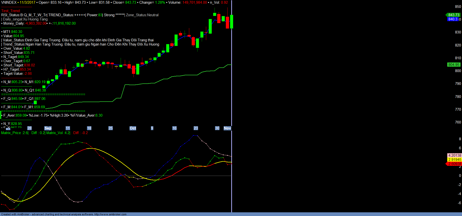 + Thống kê thị trường: Trend_up giảm nhẹ. Money_in giảm. Thống kê thị trường cho thấy khẳ năng sinh lợi của toàn thị trường tiếp tục suy giảm, tốc độ suy giảm đã chậm lại và đang có dấu hiệu tạo đáy ngắn hạn. Tuy nhiên dòng tiền Money_in lại suy giảm khá mạnh. Điều này cho thấy tỉ lệ mã hồi phục mà không có dòng tiền tham gia trong phiên giao dịch 03/11 khá cao.