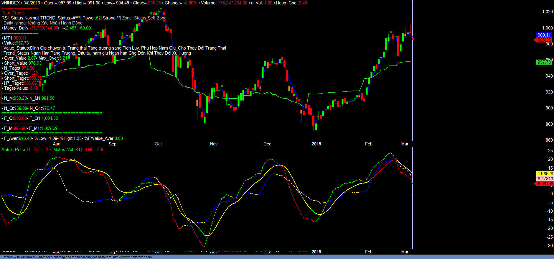 + VNINDEX có tuần giao dịch thứ 02 không thể vượt qua kháng cự 1000-1005 và tiếp tục tạo kênh tích lũy hẹp với biên độ 960-965 và 1000-1005. Hỗ trợ mạnh là vùng 955-960 tương ứng với vùng giá trị định giá (có xu hướng tích lũy) hiện nay, cũng như trend_line giảm giá trung hạn đã vượt nối 2 đỉnh 1084,2 ngày 15/05/2018 và 1024,6 ngày 04/10/2018. VN30 là 900-905. VN30 có khẳ năng sinh lợi kém nhất khi có 02 tuần giảm điểm tính từ đỉnh 944. Phiên 08/03/2019 VN30 giảm -0,8% khối lượng giao dịch giảm -18,59% và dưới mức trung bình. Điều này cho thấy, dòng tiền vẫn chưa tham gia trở lại với VN30 tại vùng giá hiện tại.
