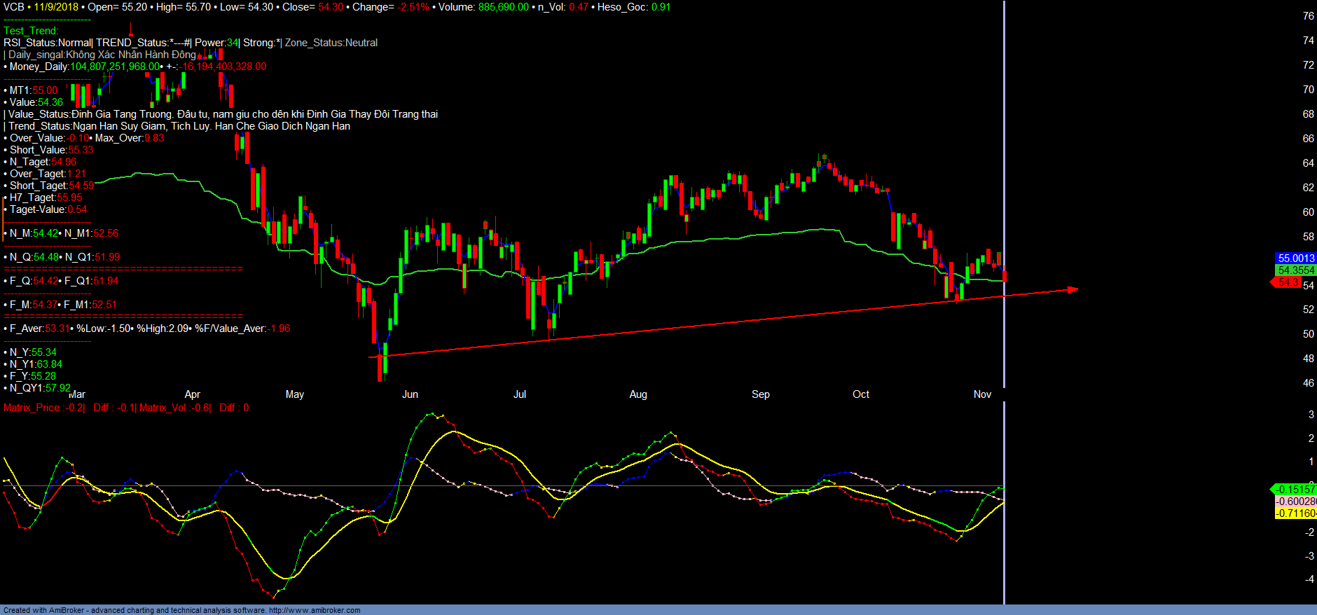 + VNINDEX, VN30 ngày 25-30/10/2018 đã có vùng giá thấp hơn thời điểm tháng 07/2018, trong khi đó nhóm cổ phiếu ngân hàng đang chịu áp lực điều chỉnh tương ứng về vùng giá thấp của tháng 07/2018 cũng như kiểm tra lại kênh giá nối từ 2 đáy tháng 07-10/2018. Như vậy trường hợp tích cực, dự kiến nhóm cổ phiếu dòng bank cũng như VNINDEX sẽ phải tạo đáy ngắn trung hạn trong 03-10 phiên giao dịch tiếp theo với hỗ trợ mốc tâm lý 900+- khi dòng bank kiểm tra thành công kênh giá hỗ trợ (tham khảo hình) với dòng tiền, khối lương giao dịch gia tăng trở lại. Do xu hướng Short_value của nhóm bank cũng như VNINDEX vẫn suy giảm. Vì vậy cần chờ những tín hiệu xác nhận vùng đáy và xu hướng phục hồi tích lũy tăng trưởng trở lại. Yêu cầu dòng bank phải phục hồi tốt trở lại khi chạm kênh hỗ trợ với khối lượng giao dịch đột biến với hệ số n_Vol duy trì lớn hơn 1