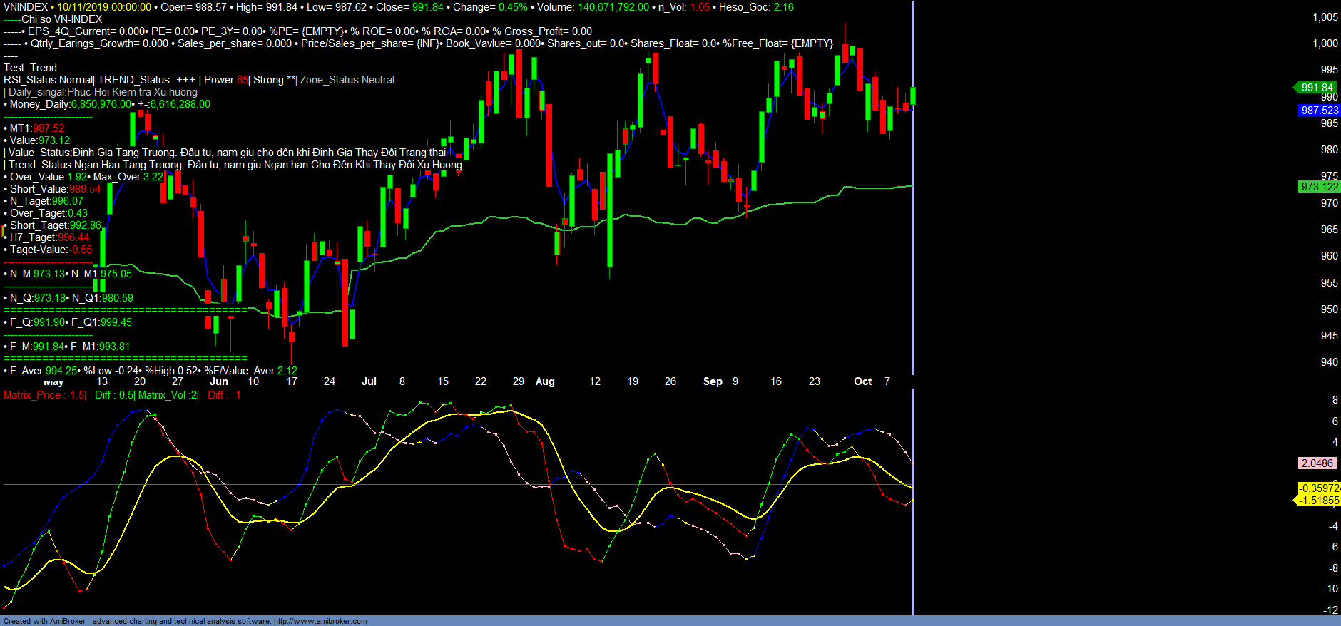 + VNINDEX kết thúc tuần giao dịch W2/10/2019 ở mức 991,84 tăng nhẹ 0,43%, khối lượng giao dịch giảm -5,07% so với tuần trước. Như vậy VNINDEX duy trì tích lũy trong biên độ hẹp kéo dài 07-08 tháng từ tháng 02/2019 đến nay. Nguyên nhân chính như đã nhiều lần phân tích là do tốc độ tăng trưởng kém. Tăng trưởng tốt chỉ duy trì rất, rất ít tập trung vào một số mã đầu ngành. Điều này dẫn đến chênh lệch định giá ngày càng cao giữa nhóm cổ phiếu nhóm 1 đầu ngành và các cổ phiếu hạng 2,3…. Thể hiện trong hầu hết các nhóm ngành. Do đó có rất ít cổ phiếu đạt chuẩn tăng trưởng toàn diện, tập trung vào nhóm số ít cổ phiếu đầu ngày ít nợ vay, hoặc phát triển doanh thu ra thị trường nước ngoài như FPT.., hoặc nhóm BDS các tỉnh có tồn kho lớn được nâng định giá lại…