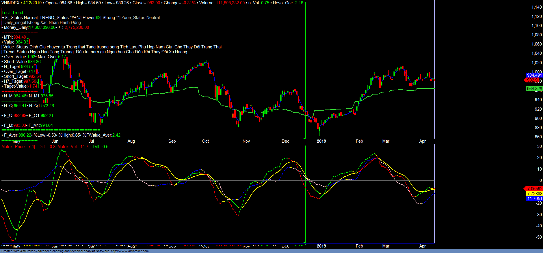 + Trend_up giảm nhẹ, Money_in giảm. Tốc độ giảm của dòng tiền Money_in ngắn hạn mạnh hơn. Điều này cho thấy rằng, sau nhịp hồi phục, nhiều mã có vùng giá vẫn chưa thể thu hút dòng tiền tiếp tục gia tăng. Ở thời điểm vùng đáy tháng 03/2019, thống kê cho thấy thị trường ngắn hạn có tỉ lệ dòng tiền thấp nhất là 26% số lượng mã trên toàn thị trường. Hiện nay dòng tiền đã quay đầu giảm, và cần chờ tín hiệu tạo đáy thứ hai của dòng tiền. Lúc đấy thị trường chung sẽ xác nhận đáy ngắn trung hạn. Số lượng mã có vùng Mua ngắn hạn vẫn duy trì lớn hơn vùng bán. Một số mã cơ bản tích cực có thể xem xét theo dõi đầu tư, đầu cơ như DVP, HT1, AGR, CCL…