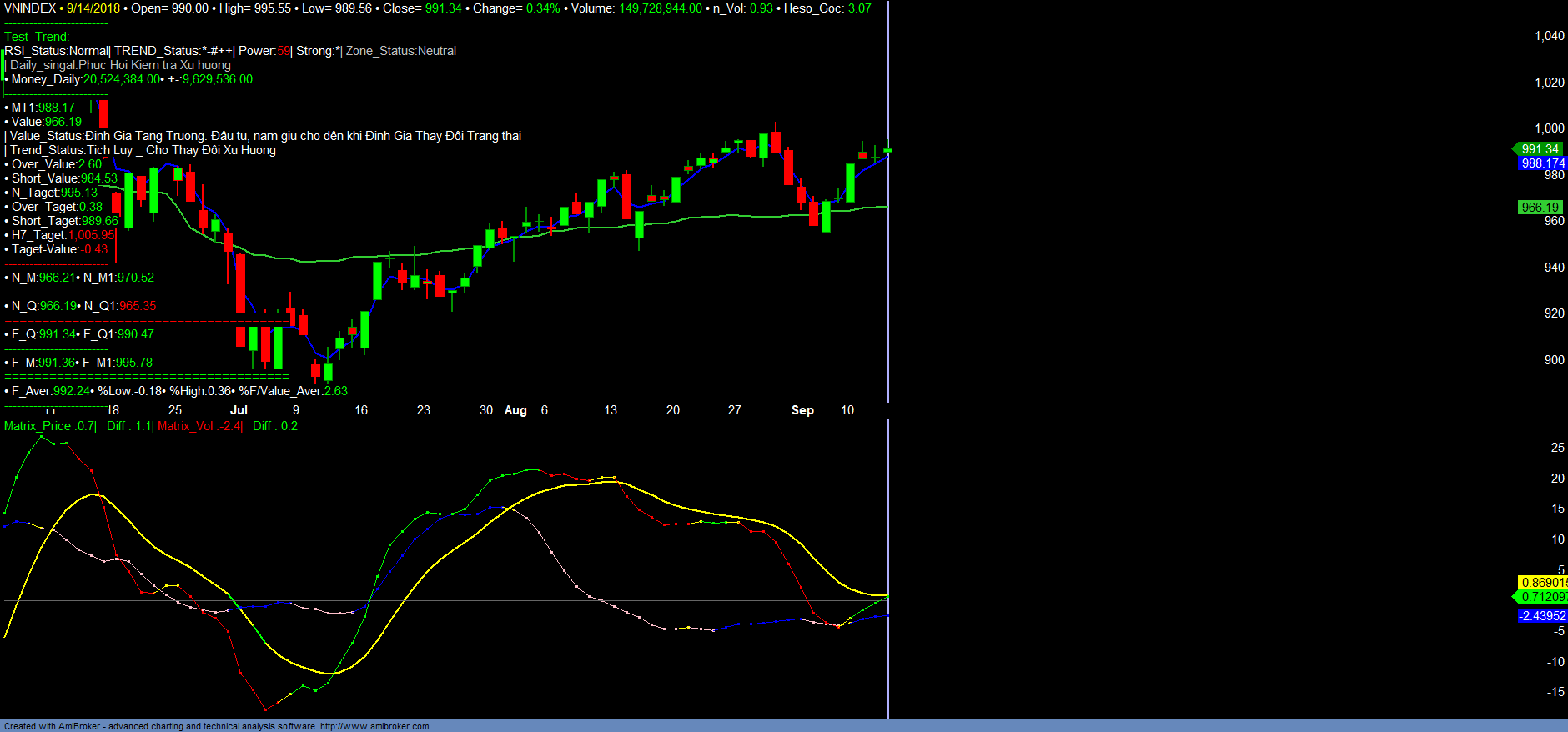 + Trend_up tăng, Money_in tăng. Dòng tiền và khẳ năng sinh lợi toàn thị trường vẫn gia tăng và luân chuyển qua nhiều nhóm mã khác. Tuy nhiên khối lượng giao dịch đã giảm trong 2 phiên gần đây cho thấy tâm lý thận trọng khi VNINDEX hướng đến vùng đỉnh cũ gần nhất 1000. Số lượng mã tăng giá trong tuần vừa qua duy trì tích cực.