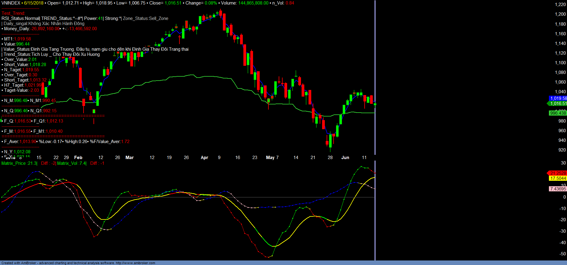+ VNINDEX trong tuần giao dịch 11-15/06/2018 giảm -2.17% với đỉnh ngắn hạn 1045.6, khối lượng giao dịch 678.401.024 cổ phiếu, giảm 8.75% so với tuần trước, mặc dù trong tuần có hoạt động cơ cấu của ETF. Xu hướng trung hạn hiện tại là tích lũy trong nền giá 1000-1045 để chờ thị trường chốt NAV quí II/2018 cũng như xác định mức độ tăng trưởng của Định giá Tăng trưởng. Khẳ năng tăng trưởng của VNINDEX trong thời gian đến dự báo là không cao. Mức độ tăng trưởng Over Đinh giá của VNINDEX lần lượt suy giảm từ các mức 8-9% về 6-7% và hiện nay đang là 4%+-,xác nhận khẳ năng tăng trưởng ngày càng suy giảm. Vì vậy, nhà đầu tư không nên đặt mức kỳ vọng quá cao về khẳ năng sinh lợi của VNINDEX cũng như các Cổ phiếu. Các mức Over sinh lợi của cổ phiếu tăng trưởng tốt nhất chỉ kỳ vọng 10-15% trong giai đoạn hiện nay.