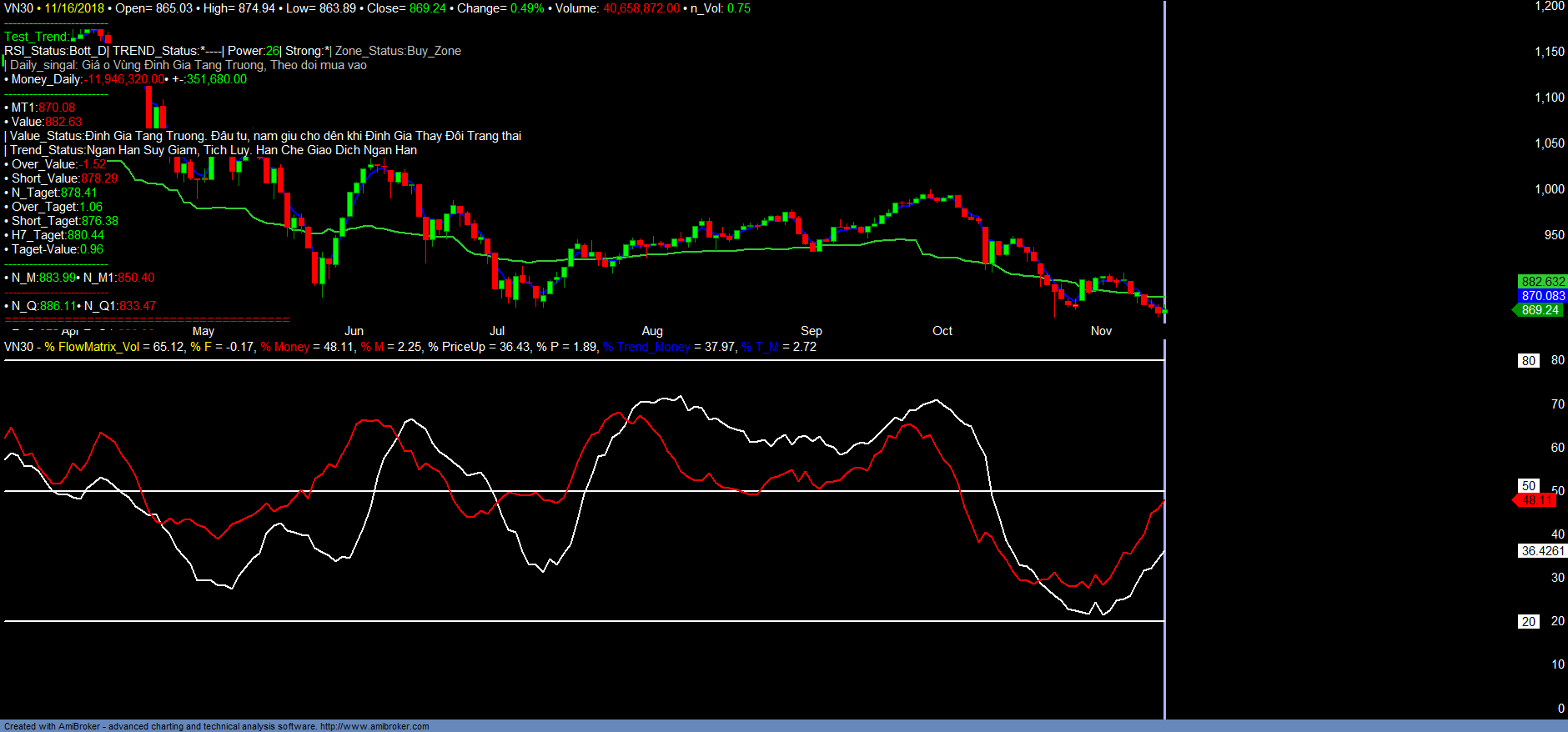 + Trend_up tăng, Money_in tăng. Dòng tiền vẫn duy trì xu hướng tăng, tốc độ tăng mạnh hơn và đang dần tiến đến vùng trung bình 50%. Trend_up, khẳ năng sinh lợi vẫn duy trì tăng, tốc độ tăng chậm lại. Số lượng mã vùng mua, theo dõi mua ngắn hạn vẫn duy trì lớn hơn vùng bán. Tập trung vào nhóm mã Ngân hàng, Bất Động Sản, Dầu khí, Chứng khoán.. và một số mã nổi bật đôt biến như QNS, SHN, POW là những nhóm mã có thể theo dõi cho vị thế mua ngắn hạn.