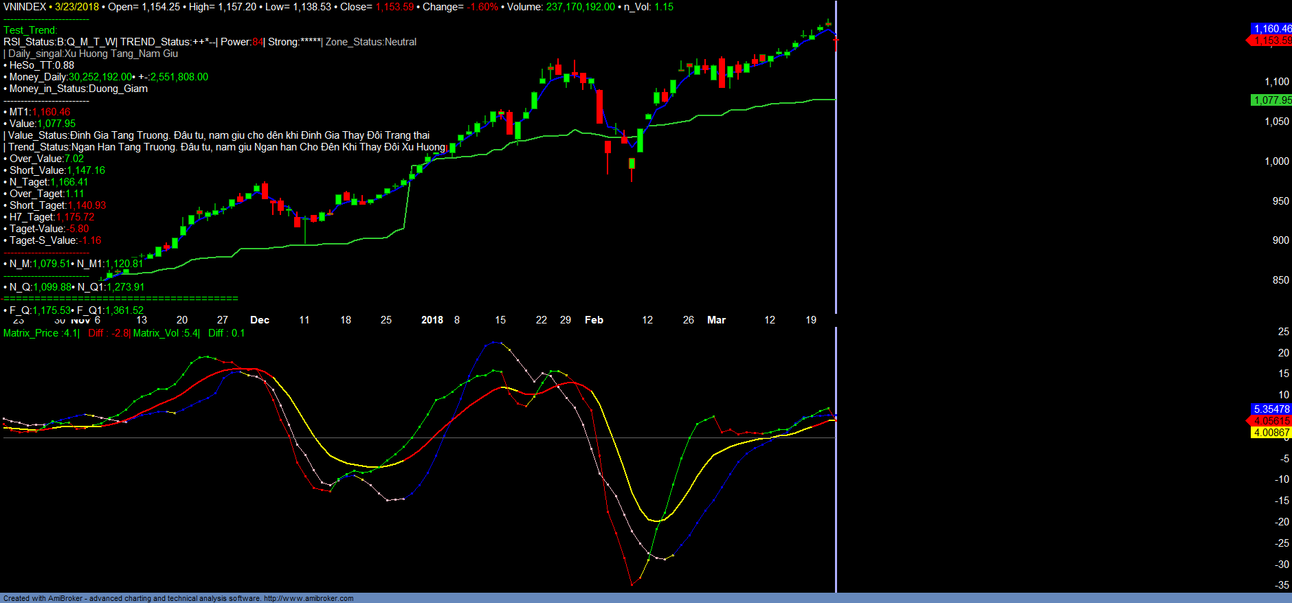 + Trend_up giảm nhẹ, Money_in giảm. Áp lực bán mạnh trên toàn thị trường, nhất là đối với VN30 ngoại trừ 1 số nhóm mã như dầu khí, săm lốp hay thủy sản VHC, FMC, TS4 hay DHG, BCC, HNG… vẫn duy trì xu hướng tích cực.