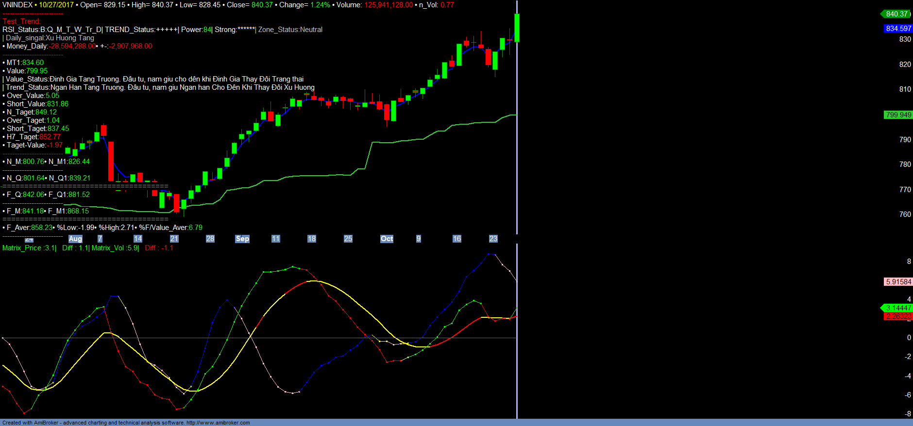 + Thống kê thị trường: Trend_up giảm, Money_in giảm. Cổ phiếu ROS là nhân tố chính ảnh hưởng đến VN30, VNINDEX sau khi vượt vùng đỉnh cũ 161,7. Ngắn hạn tại mức giá gần 200 thì dòng tiền ngắn hạn của ROS đang giảm dần, điều này cho thấy, với thị giá hiện tại là kém hấp dẫn và ROS cần tích lũy, điều chỉnh trong thời gian đến. Mặc dù điểm số VN30 và VNINDEX tiếp tục tăng vượt giá trị đỉnh cũ, tuy nhiên bản chất toàn thị thị trường vẫn suy yếu, khẳ năng sinh lợi của toàn thị trường và dòng tiền vẫn suy giảm. Áp lực bán hạ tỉ trọng ngắn hạn rất lớn. Chỉ số HNXINDEX hiện đang cho tín hiệu kết thúc giai đoạn tăng trưởng mạnh kéo dài từ tháng 12/2016 ở vùng giá 78-80 đến 110 hiện nay. Dự kiến HNXINDEX sẽ chuyển sang giai đoạn điều chỉnh tích lũy để kiểm tra lại xu hướng tăng trưởng của giá trị định giá. Như vậy hiện nay việc mở thêm vị thế mua mới vẫn chưa được khuyến nghị gia tăng. Nhà đầu tư tiếp tục cân đối tỉ trọng ngắn hạn. Kiên nhẫn chờ tín hiệu Trend_up tích lũy tạo đáy và phục hồi trở lại, cũng như chờ tín hiệu HNXINDEX kết thúc xu hướng tích lũy và test xu hướng tăng trưởng của định giá thành công. Kiên nhẫn chờ đợi thị trường xác nhận nhóm mã, các mã sẽ tiếp tục có xu hướng tăng trưởng mạnh trong năm tài khóa 2018 sắp đến. Có thể mở thêm vị thế mua đầu tư đối với các mã trong danh mục đề xuất đã cập nhật. Chi tiết tham khảo Matrix_Fiter và các Danh mục.